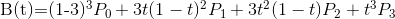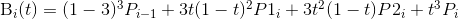 Tips:其中t为属于区间[0,1]的参数。P0和P3为起点和终点(knot point),而P1和P2分别靠近P0和P3的控制点(control point)。你可能会感到疑惑,P为点怎么和实数进行运算,在这里我们规定:若P为点(X,Y),P1为点(M,N),那么P*t=(t*X,t*Y),P+P1=(X+M,Y+N).